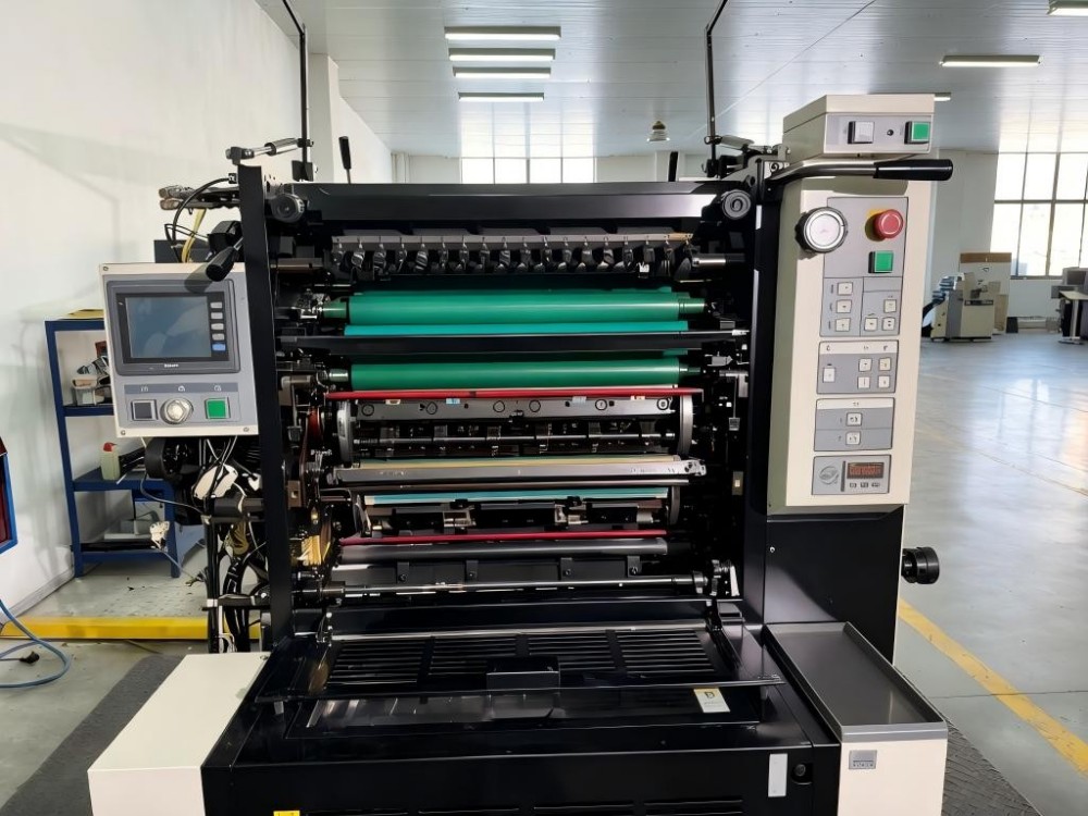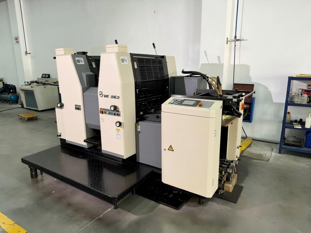Dit is een tweekleurige zelfklevende (label) offsetdruk met velleninvoer op A2-formaat. Het wordt geleverd met een stevige en duurzame structuur. Het maakt gebruik van een zwenkarminvoer om papier op te nemen. Het beweegt het papier op een gestage manier vooruit. Grijpers met dubbele veren voorkomen dat het papier wegglijdt. Het werkt goed voor afdrukken op hoge snelheid. Er kan op zowel dun als dik papier worden afgedrukt. Dankzij de programmeerinterface met touchscreen kunnen gebruikers instellingen snel wijzigen.