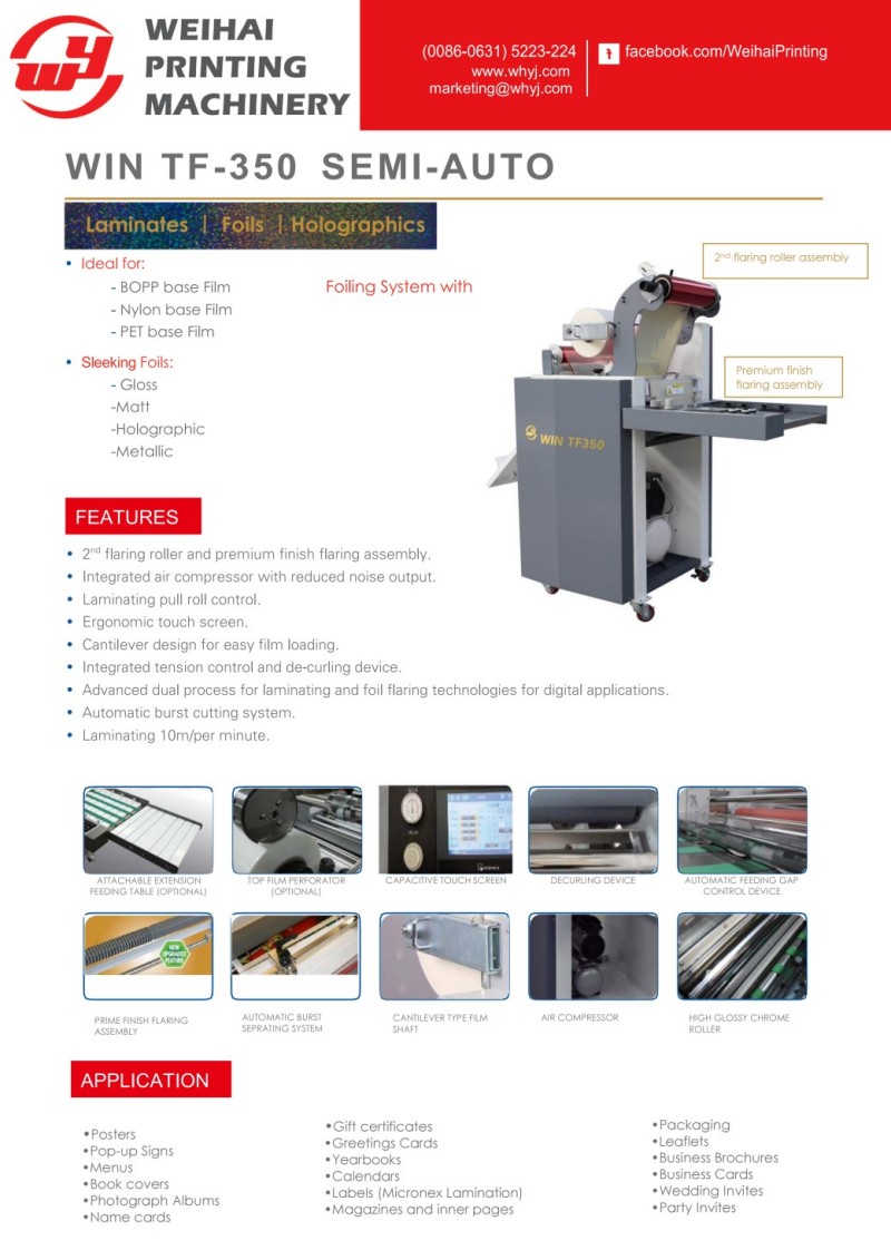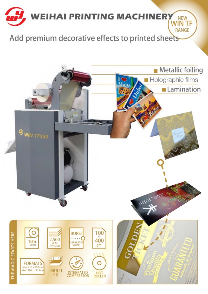 WIN biedt een professionele lamineer- en foliemachine (TF350/ATF380), ook wel Platemaking-Free Laminating and Foiling Machine genoemd, die naadloos aansluit op de digitale pers en de digitale inkjetpers met vellentoevoer. Deze uiterst efficiënte post-press-apparatuur integreert functies voor lamineren, hot stampen en koud verijdelen. Het kan glanzende, matte en laserfilms aanbrengen, evenals nauwkeurige metaalfoliedruk in één doorgang. Met nauwkeurige temperatuur- en drukcontrole zorgt deze lamineer- en foliemachine voor luchtbelvrije, kromtrekkingsvrije en stevige stempeleffecten. Het ondersteunt automatische papierinvoer, stabiel transport en uiterst nauwkeurige registratie, waardoor het uiterlijk en de toegevoegde waarde van gedrukte producten aanzienlijk worden verbeterd. Deze lamineer- en foliemachine is duurzaam en eenvoudig te bedienen en wordt veel gebruikt voor hoogwaardige visitekaartjes, geschenkdozen, certificaten, boekomslagen en premium promotiemateriaal.