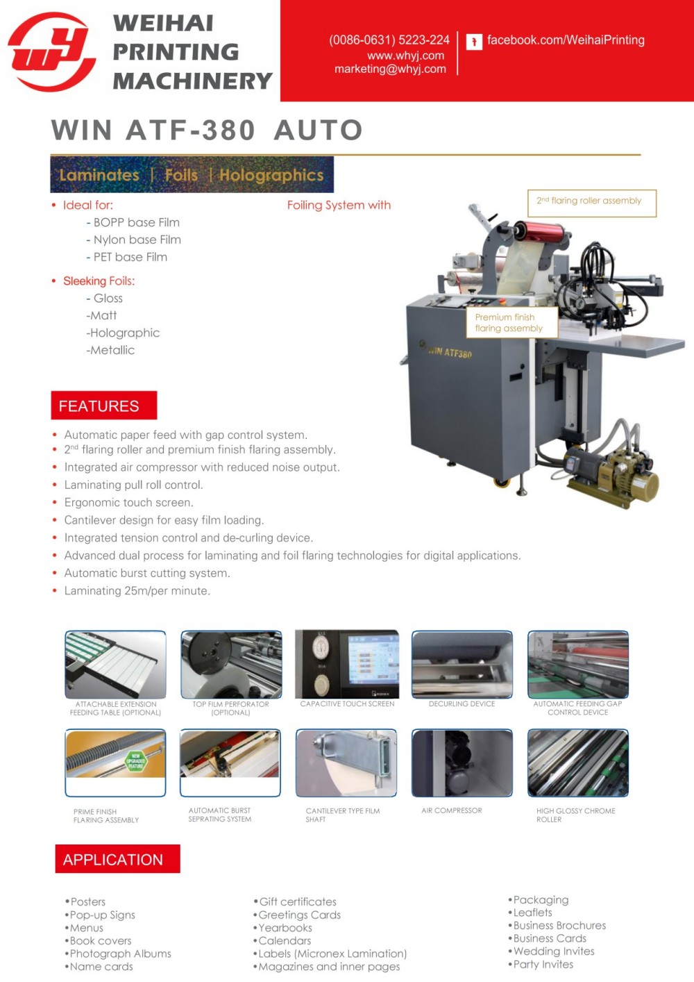 De plaatmaakvrije lamineer- en foliemachine, ontworpen en vervaardigd door Weihai Printing Machinery Co., Ltd., is een handmatige lamineer- en metaalfoliemachine met papierinvoer. Het compacte ontwerp bespaart ruimte bij het inpakken in zowel lamineer- als metaalfoliefuncties - ideaal voor bedrijven die intern decoratieve accenten willen toevoegen. Het zet gewoon drukwerk om in voortreffelijke eindproducten en werkt naadloos samen met zowel digitale on-demand toepassingen als traditionele lithografische offsetdrukken. Om de best mogelijke resultaten te verkrijgen, is hij uitgerust met een elektronisch regelapparaat dat de roldruk en de verwarmingstemperatuur tijdens bedrijf aanpast. Deze aanpassingen zijn gebaseerd op factoren zoals rijsnelheid, papierdikte en ontwerppatronen. Deze machine heeft zich bewezen als een eersteklas heetstempel- en lamineerapparaat zonder plaatproductie, waarmee klanten aanzienlijke waarde aan hun producten kunnen toevoegen. Klanten kunnen ook kiezen uit een ruim assortiment lamineerfilms en metaalfolies, zodat ze aan al hun decoratieve behoeften kunnen voldoen. Bovendien beschikt hij over een verlengde papierinvoertafel, perfect voor banners en extra lang drukwerk.
